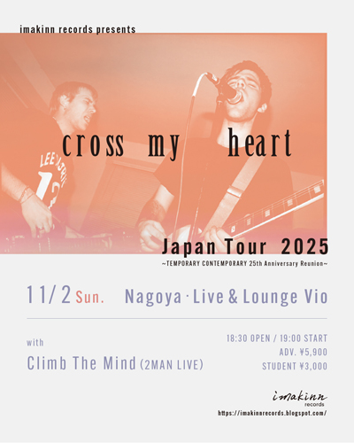 ■オフィシャルアカウント【X】【Instagram】【YouTube】 ■JAWBREAKERジャパンツアー名古屋編に出演させていただきます ![]() 2025年12月1日(月)名古屋 クラブクアトロ [ THE CHILL OF FALL 2025 JAPAN ] OPEN18:00 / START19:00 前売8800円 / 当日9800円(+1D) 出演: JAWBREAKER Climb The Mind Academy Fight Song チケット: イープラス https://eplus.jp/jawbreaker/ ぴあ https://w.pia.jp/t/jawbreaker25/ ■CROSS MY HEART Japan Tour 2025に出演させていただきます ![]() 2025年11月2日(日)名古屋 新栄Live & Lounge Vio [ imakinn records presents CROSS MY HEART Japan Tour 2025 ] OPEN18:30 / START19:00 前売5900円 / 学生3000円 出演: CROSS MY HEART Climb The Mind チケット: https://eplus.jp/sf/detail/4378390001-P0030001 ■moreruリリースツアーに出演させていただきます ![]() 2025年11月28日(金)名古屋 今池HUCK FINN [ moreru 4th Album Release Tour ] OPEN18:30 / START19:00 前売3000円(+1D) 出演: moreru Climb The Mind 天国注射 チケット: https://t.livepocket.jp/e/moreru4th1128 ■Deerhoof Japan Tour 2025に出演させていただきます ![]() 2025年11月16日(日)名古屋 今池TOKUZO [ 7e.p. presents Deerhoof Japan Tour 2025 ] OPEN18:00 / START19:00 前売5800円 / 当日6500円(+1order) 学生1000円割引 出演: Deerhoof Climb The Mind チケット: https://7ep.net/events/deerhoof251116/ ■Climb The Mind「近影」MV公開しました ![]() Climb The Mind 「近影」 撮影・編集:三浦知也 https://www.youtube.com/watch?v=2LaopdJrII8 ■Climb The Mind 4thアルバム「蕾」発売中 ![]() Climb The Mind 4thアルバム「蕾」CD 2,200円(+税)STSL-203 1.灯火 2.ヒューマンビーン 3.避雷針 4.歩み 5.アーチをくぐれば 6.蕾 7.ペーパームーン 8.無実の果実 9.つよがり SOUND CLOUDで曲の試聴ができます。 https://soundcloud.com/climb-the-mind |